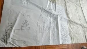 今回の場合は、大きな紙に息子が描いた世界のタワーの絵。