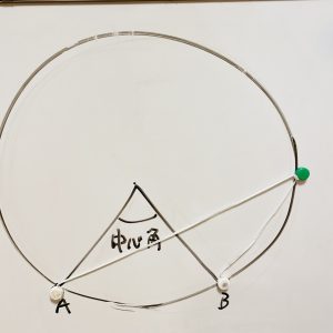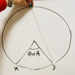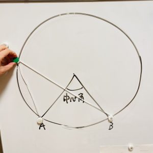 磁石とゴムで実際に動かして、同一の弧の円周角はどこでも角度が等しいことを見て動かしてもらいます。