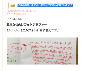『「今の自分」をマインドマップで書いて気づいたこと』 こんばんは。起業女性向けフォトグラファー24photo(ニシフォト)西ゆきえです。 5分間無心になって「今の自分」というテーマで思いついたことをマインドマ…