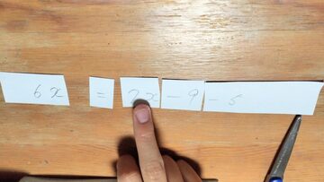 というわけで、引き続き一次方程式でもこのハサミで切って移動させる、という方法でやってもらっています。