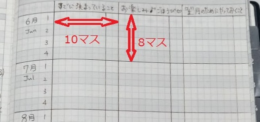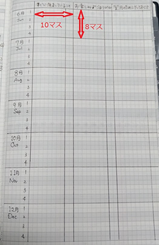 横10マス・縦8マスで区切るとキレイに12ヶ月とれます。