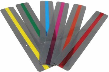 暗記のときに使う赤シートみたいなののいろんな色がセットになったものです。カラーバールーペは大きいしかさばるし、色の違いがなかなか試せないけど、これはシート状になっているので、その子が見えやすい色を選ぶのに重宝します。